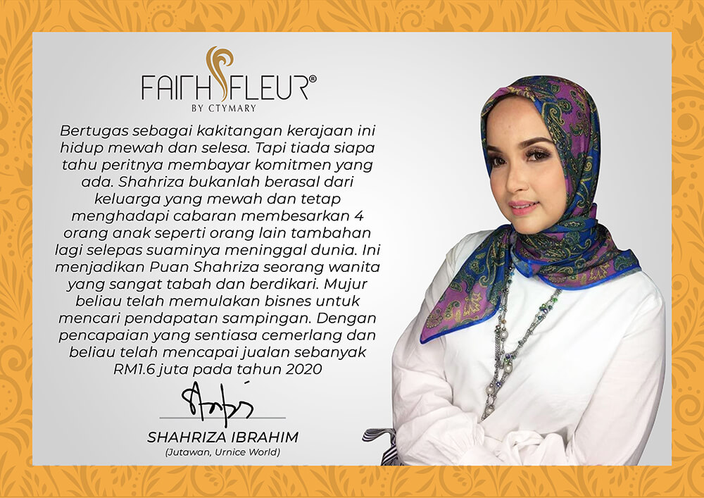 Faith Fleur adalah jenama penjagaan rambut paling dikenali di Malaysia. Diasaskan oleh Puan Siti Mariam Abdul Samad bagi membantu wanita yang ingin memiliki pendapatan sendiri melalui bisnes. Kini, 7 pengedar Faith Fleur berjaya menjana pendapatan sehingga 7 angka sebulan.